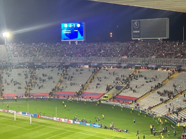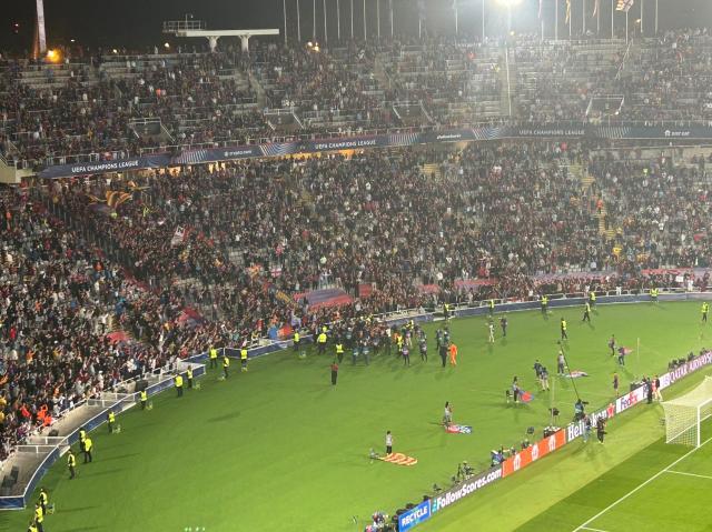 当拉菲尼亚将皮球第3次送入诺伊尔身后的球门,让巴萨以4比1的比分遥遥领先拜仁,蒙锥克体育场彻底陷入疯狂,看台上的球迷纷纷涌向内场,与冲到看台前的巴萨众将共同庆祝这幸福的时刻。除了客场看台上的拜仁球迷外,全场球迷纷纷迸发出最疯狂的热情,“巴萨!巴萨!巴萨!”的喊声响彻整个体育场。